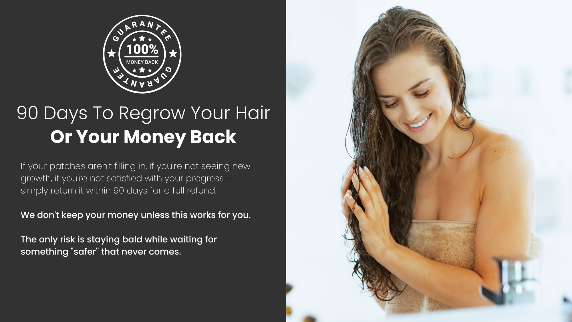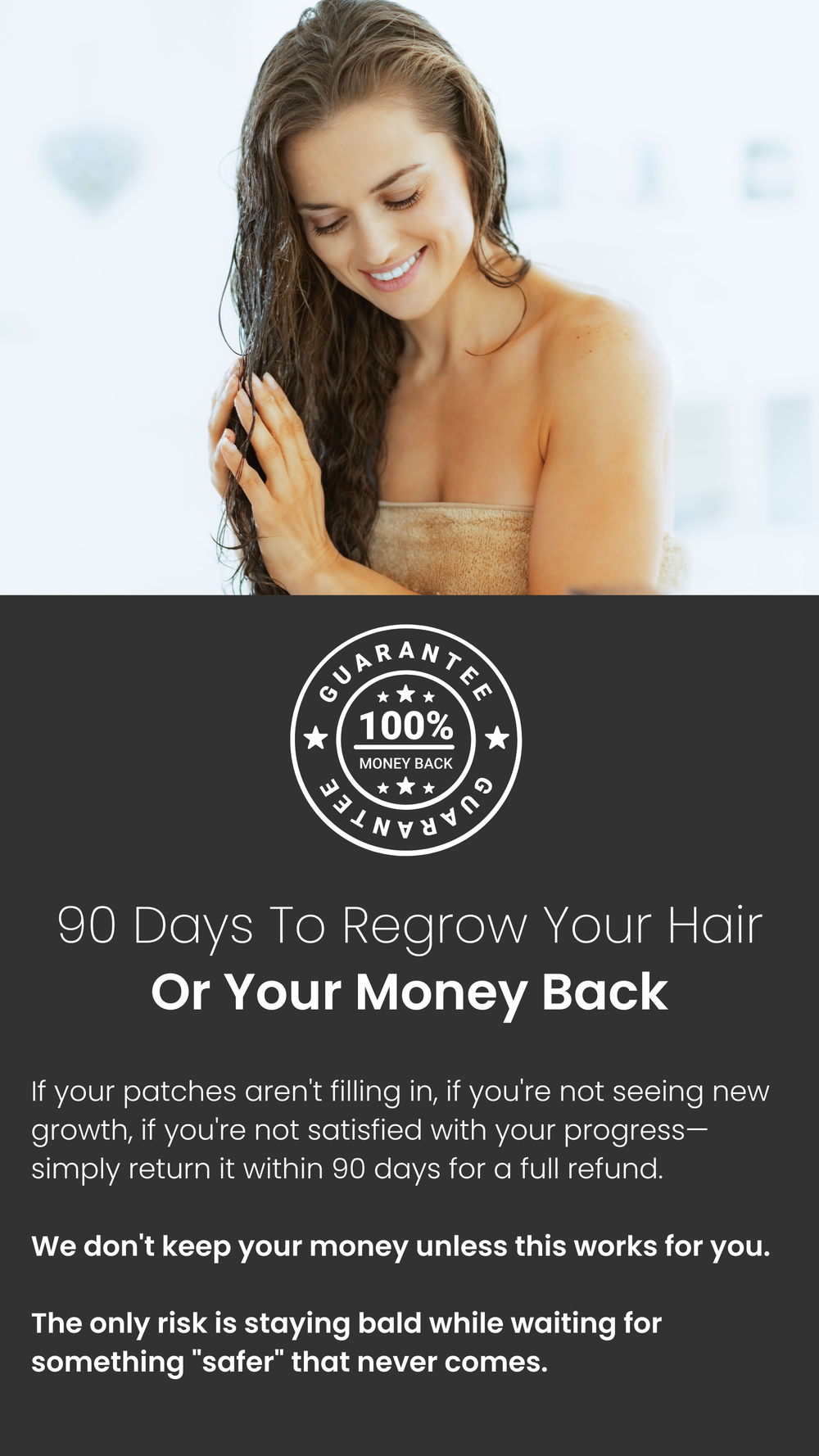 You're protected by our 90-day money-back guarantee. Follow the protocol as directed. If you're not seeing regrowth in your patches or satisfied with your progress, simply return it for a full refund. No questions asked.